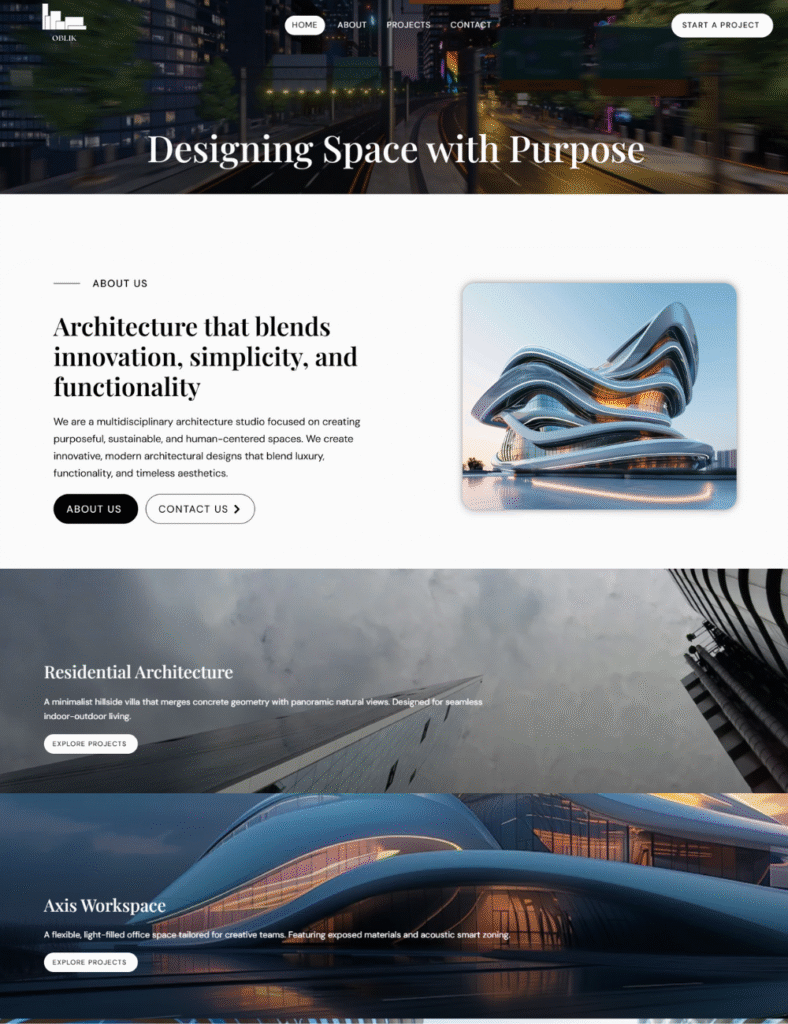 Un template Elementor pulito, elegante e moderno, perfetto per studi di architettura, interior designer e professionisti creativi.
