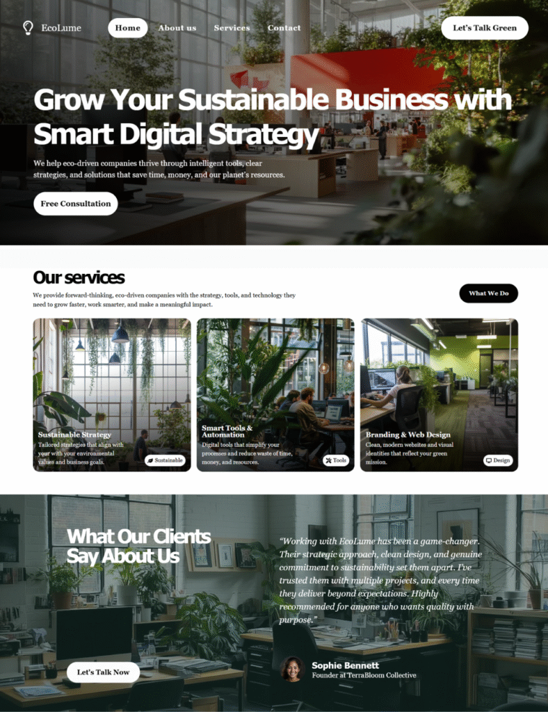 Un template Elementor pulito, professionale ed eco-consapevole progettato per aziende sostenibili e startup green.