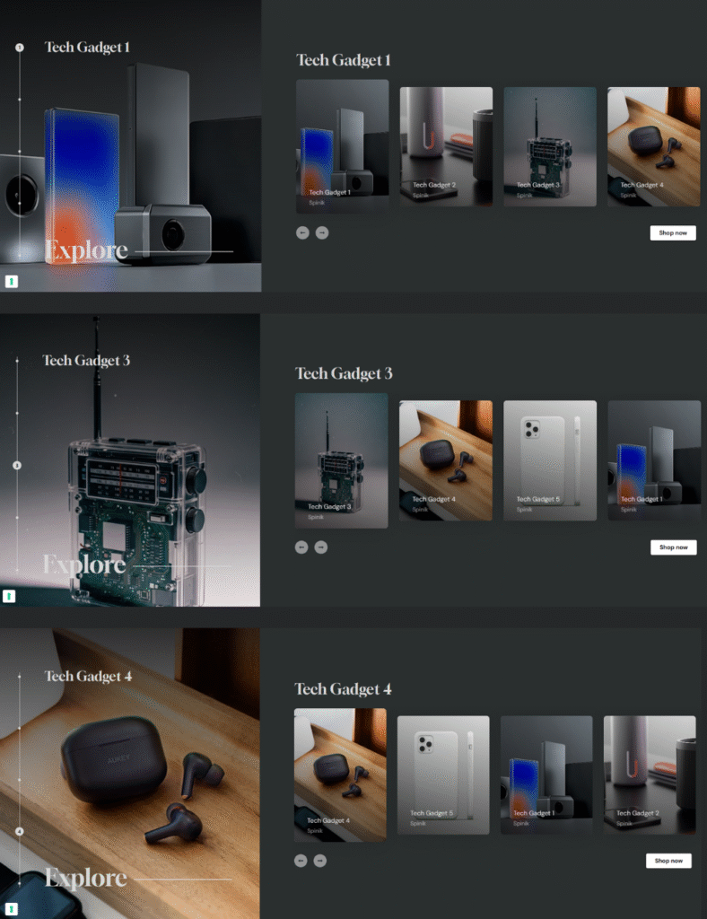 Un template a pagina singola elegante e dinamico, con uno slider di prodotti progettato per i marchi tecnologici e di gadget.